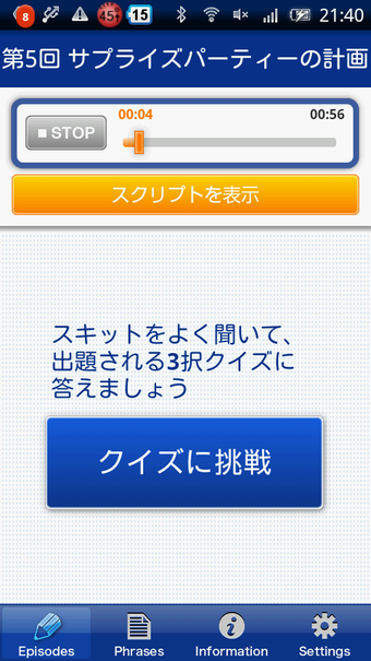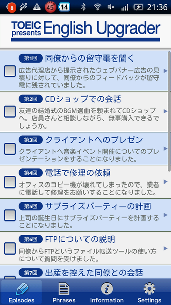 EnglishUpgrader(イングリッシュ アップグレーター)は、TOEIC(国際コミュニケーション英語能力テスト)の運営団体である国際ビジネスコミュニケーション協会が提供するAndroid向け英語学習アプリです。ビジネスや日常などさまざまなシチュエーションで使われる実際の英会話を聞いて理解度のチェックや鍵となるフレーズを練習することができます。実際のTOEICの問題と直接関係しているわけではありませんが、実際に起こりうる場面が想定された会話となっていますので、英会話のステップアップを図りたい人にはおすすめの無料アプリです。