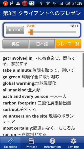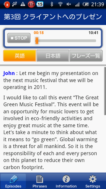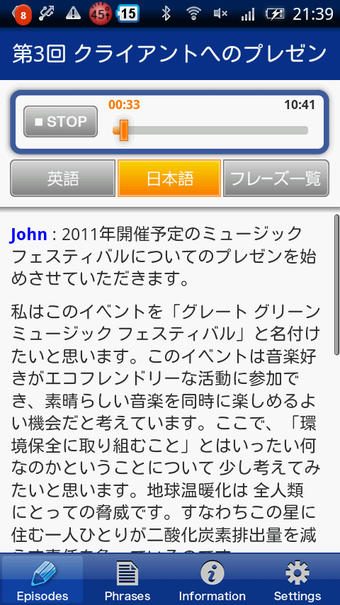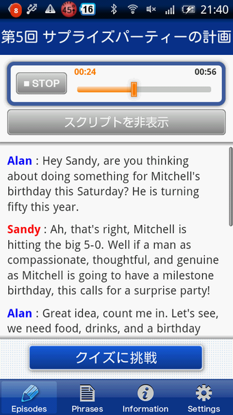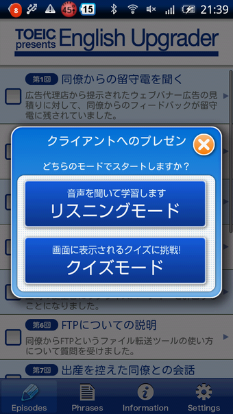 EnglishUpgraderを起動すると、ビジネスや日常のシチュエーションに合わせた12のエピソードが一覧で表示されます。「出産を控えた同僚との会話」や「新プロジェクトについての説明」などのエピソードから一つを選ぶと、音声を聞いて学習する「リスニングモード」か、理解度を試す「クイズモード」を選択します。「リスニングモード」ではエピソードに応じた英会話を聞きリスニング能力を鍛えます。会話の内容は英語でも日本語でもテキスト表示でき、それぞれ意味の把握や単語の確認をしながら学習を進められます。